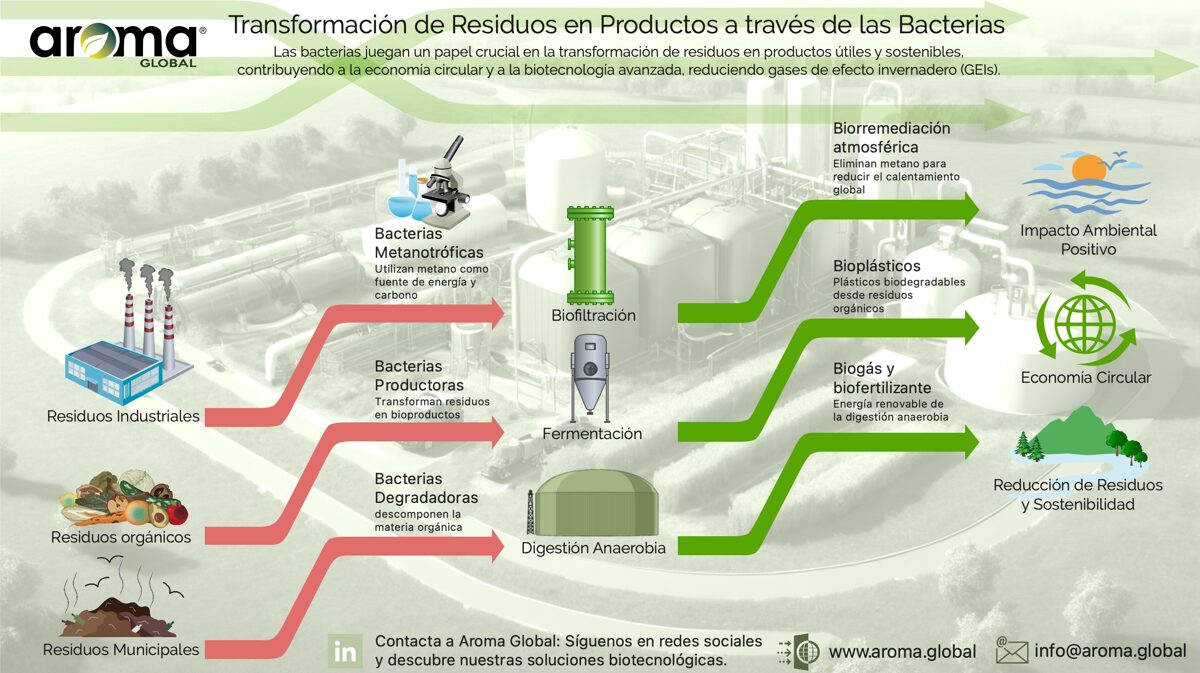 En Aroma Global® transformamos residuos en productos útiles y sostenibles mediante bacterias especializadas. Estas bacterias descomponen residuos orgánicos, producen nuevas materias primas y promueven una economía circular.